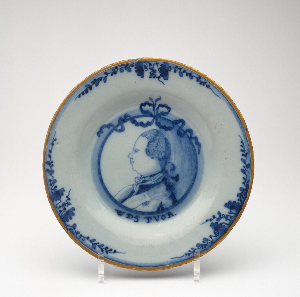 Rond bord met op het plat een portret van Willem V met het onderschrift: WDV PVOR. Op de rand zijn drie bloem- en bladranken geschilderd. Gele bies.