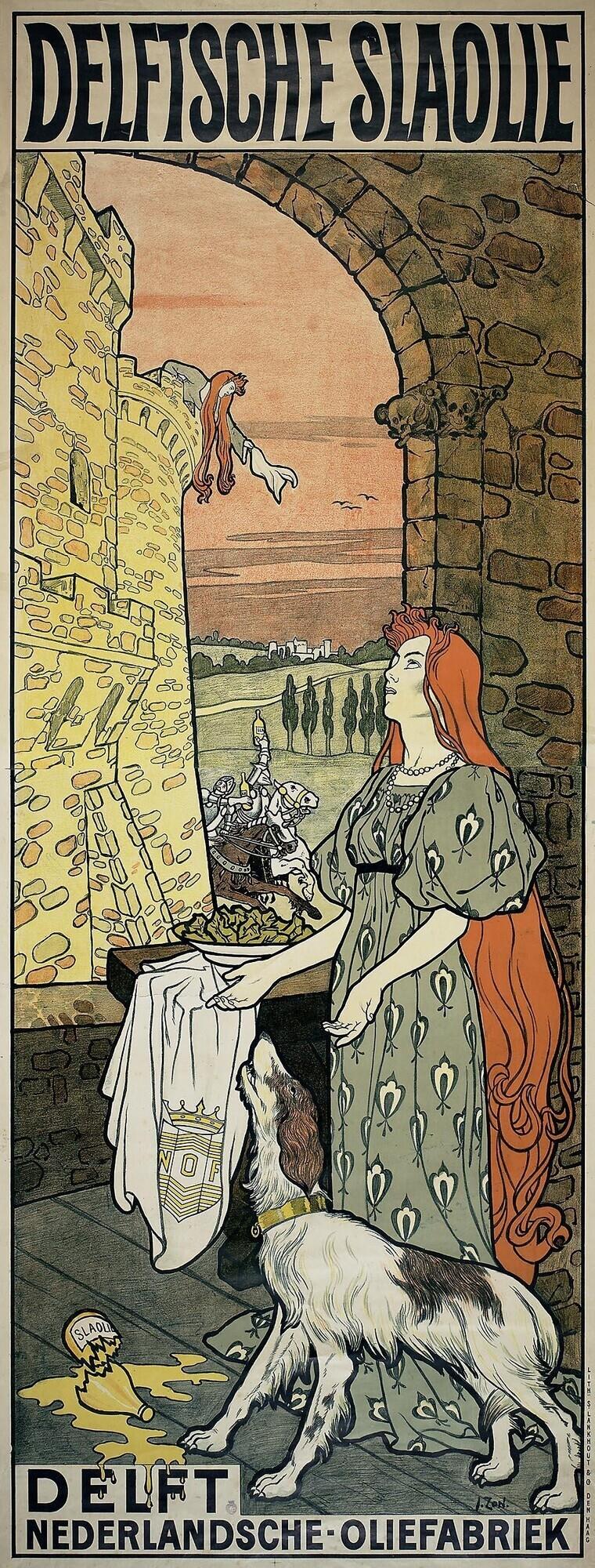 Affiche 'Delftsche Slaolie', met jonkvrouw met gebroken fles slaolie. Op de achtergrond kasteel met weggalopperende ridders met flessen slaolie in de hand, nagewuifd door jonkvrouw in kasteel.