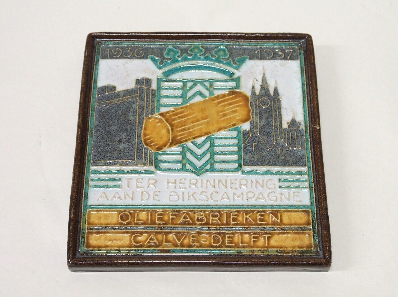 - Cloisonné tegel 'Oliefabrieken Calvé Delft Ter herinnering aan de bikscampagne 1936-1937'