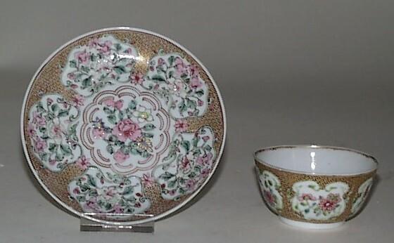 - porselein, decoratie in famille rose-techniek in wit, geel, groen, blauw, roze, ijzerrood en zwart, bovenglazuur goud