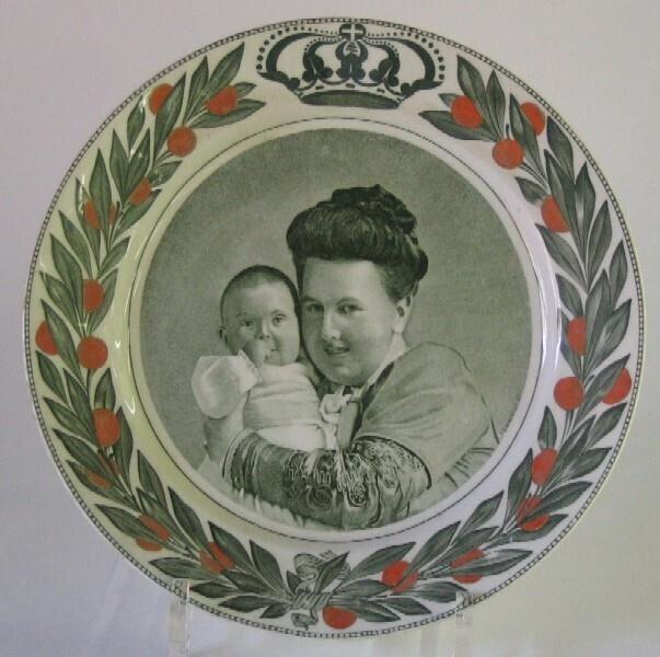 Het ongedateerde bord, dat is vervaardigd ter gelegenheid van de geboorte van koningin Juliana, is aan de voorkant versierd met een transferafbeelding van koningin Wilhelmina met haar dochter op de arm. Op de rand is een lauwerkrans met oranjeappe...