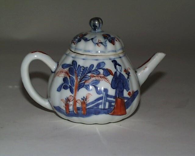 - porselein, decoratie in Imari-techniek in blauw en ijzerrood, bovenglazuur goud