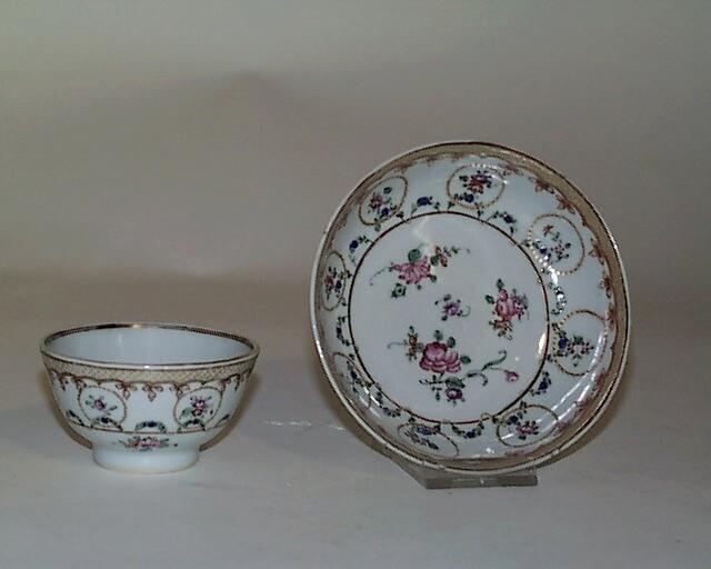- porselein, bovenglazuur goud, decoratie in famille rose-techniek in Lowestoft-stijl in groen, paars, lila, zwart