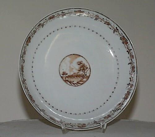 De gewelfde schotel heeft een standring en op het plat, binnen een dubbele cirkel, een decor van een Europees rivierlandschap met bomen, een huis en een muur. De wand is gedecoreerd met een band van kleine bloemen. Langs de rand loopt een band met...