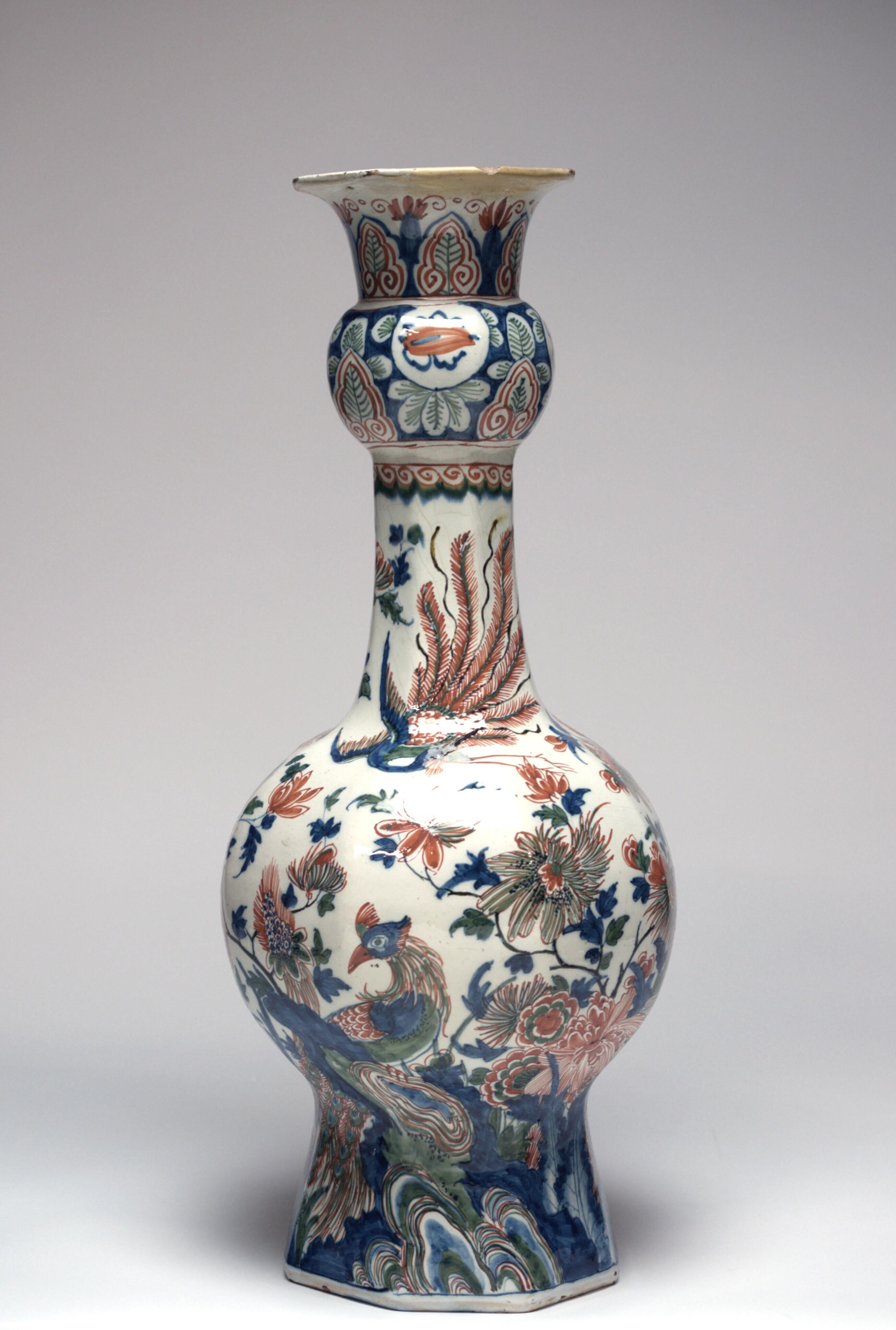 De achtkantige knobbelvaas of -fles heeft een bolle buik, slanke hals met uitdijende voet en lange hals met knobbel en kragende mondopening en is gedecoreerd met planten, bloemen, bloesemtakken, rotsen en water. Centraal staat een pauw op een rots...