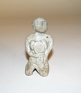 Het sculptuurtje verbeeldt een vrouw in kleermakerszit met een waaier in de rechter hand.