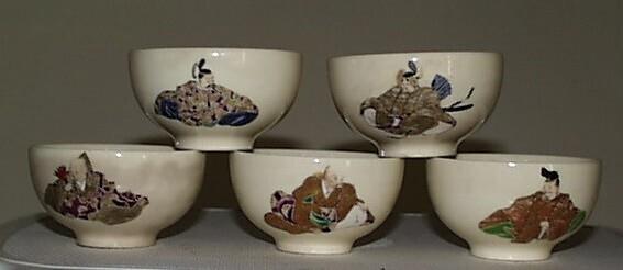 De kommen hebben een standring. De kommen zijn half bolvormig en hebben elk een decor van een zittende acteur en aan de andere zijde een Japanse tekst.