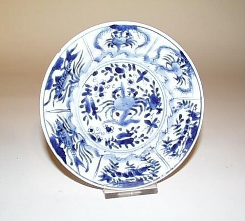Het licht gecontourneerde schaaltje heeft een smalle, schuin oplopende rand en een standring. Het plat heeft binnen een dubbele cirkel een decor van een krab met waterplanten, waaromheen een band met golven loopt. De rand is gedecoreerd met zes ca...