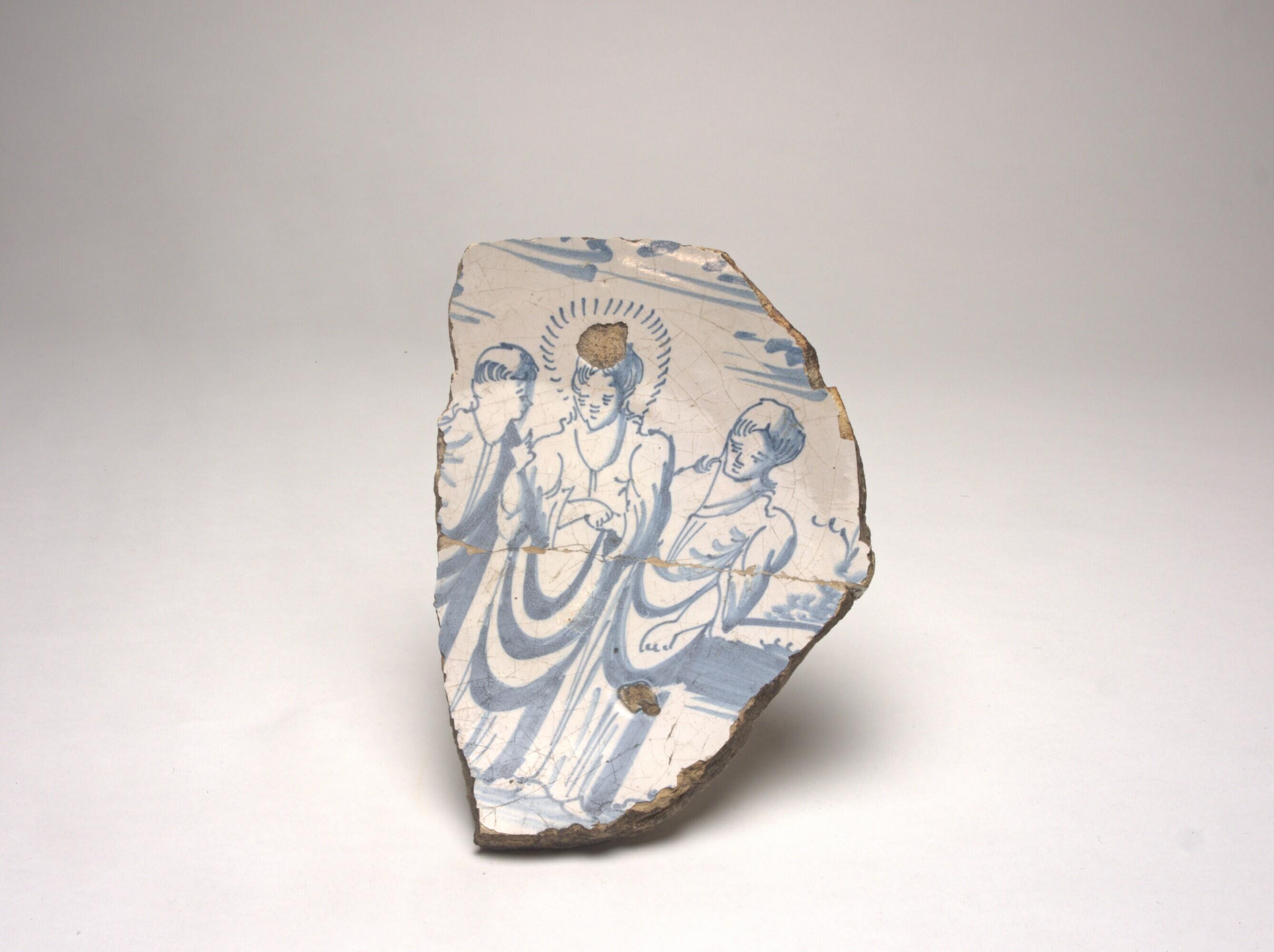 Het fragment van een schotel toont Christus met 2 discipelen.