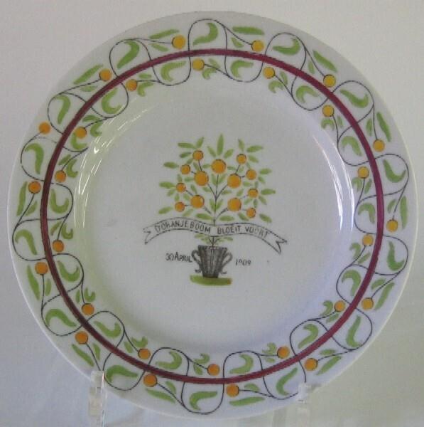 Het bord, dat is vervaardigd ter gelegenheid van de geboorte van koningin Juliana, is aan de voorzijde voorzien van een transfer (gedrukte) decoratie. In het plat is een boompje met oranjeappels in een pot afgebeeld. Voor de stam is een banderol m...