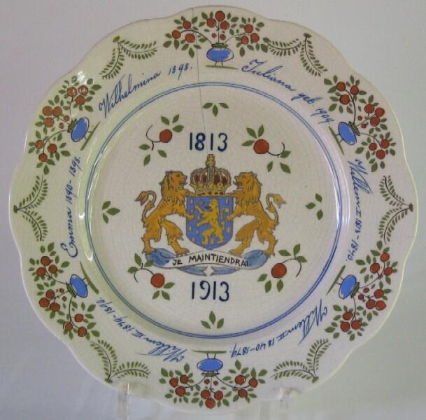 Het bord, dat is vervaardigd ter gelegenheid van het 100-jarig bestaan van het Koninkrijk Holland, is aan de voorkant in het plat beschilderd met de gekroonde Nederlandse leeuw met een pijlenbundel en een zwaard in de klauwen. Het gekroonde schild...