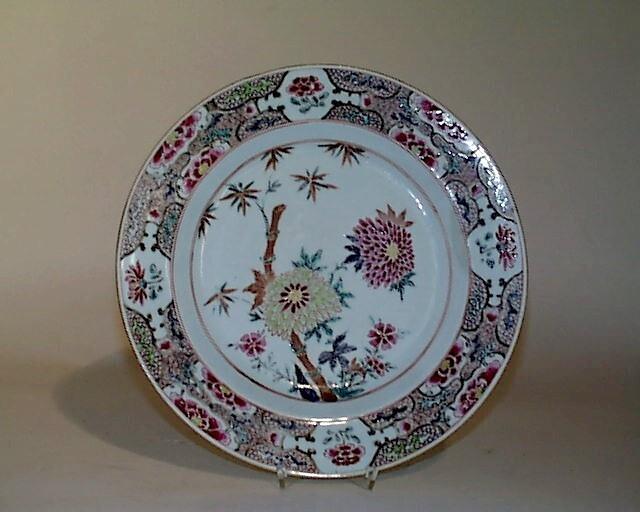 De schotel heeft een brede, schuin oplopende rand en een standring. Het plat heeft, binnen een enkele cirkel, een decor van bamboe, pioenrozen en vermoedelijk stokrozen. De rand is gedecoreerd met fijn servetwerk in grillig gevormde vakken, waarin...
