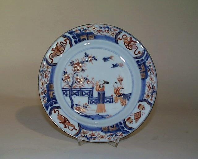 - porselein, decoratie in Imari-techniek in blauw en ijzerrood, bovenglazuur goud