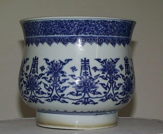 De cachepot is buidelvormig en heeft een hoge standring. Boven de standring is een band met afwisselend grote en kleine driehoeken. De buik is gedecoreerd lotusbloemen op hoog rankwerk afgewisseld met lotusbloemen op laag rankwerk waarboven shou-k...
