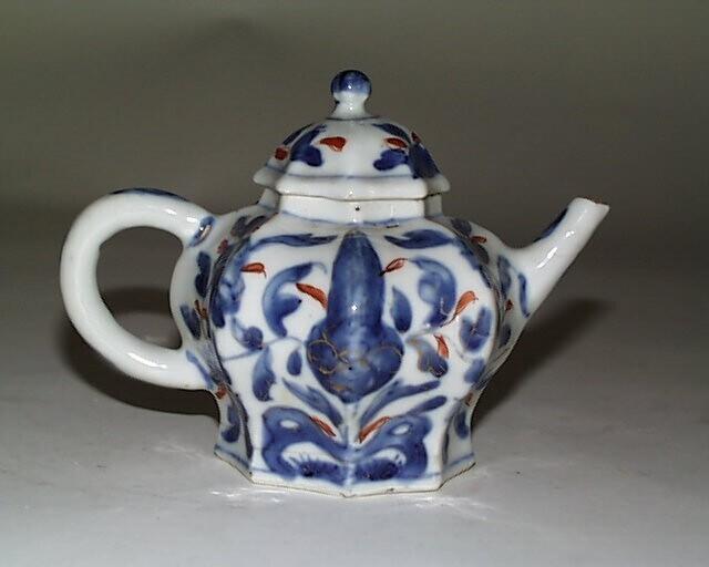 - porselein (gedrukt), decoratie in Imari-techniek in blauw, ijzerrood en bovenglazuur goud