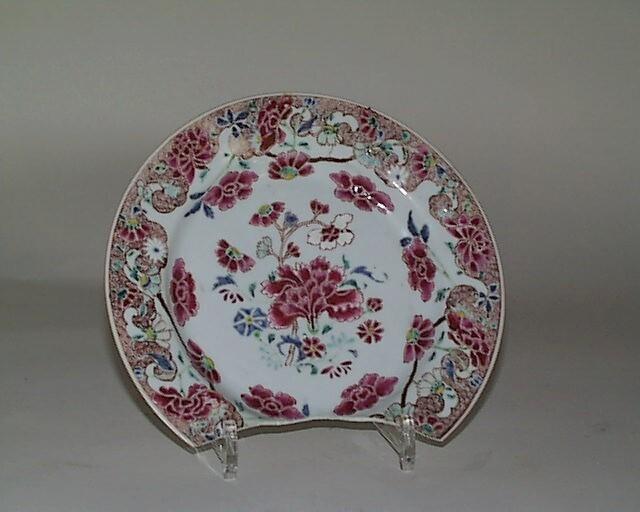 - porselein, decoratie in famille rose-techniek in wit, geel, blauw, turkoois, groen, roze, ijzerrood, paars, zwart, bovenglazuur goud, kapucijner rand