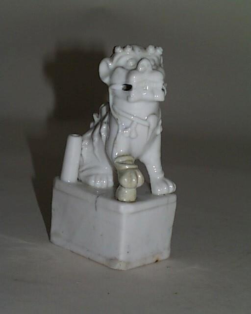 De blanc de Chine wierookstokjeshouder heeft de vorm van een boeddhistische leeuw op een sokkel. De manlijke leeuw, die op een slang bijt, heeft lange manen en een bal onder de rechter voorpootbijtend. Naast de rechter achterpoot bevindt zich het ...