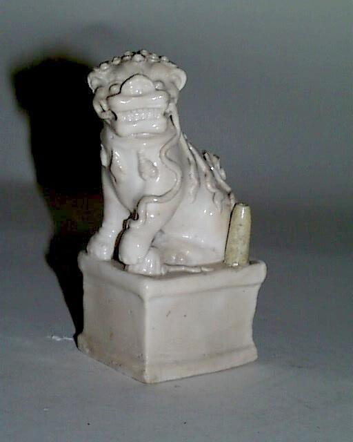 De blanc de Chine wierookstokjeshouder heeft de vorm van een boeddhistische leeuw op een sokkel. De manlijke leeuw, die op een slang bijt, heeft lange manen en een een bal onder de linker voorpoot. Naast de linker achterpoot bevindt zich het houde...