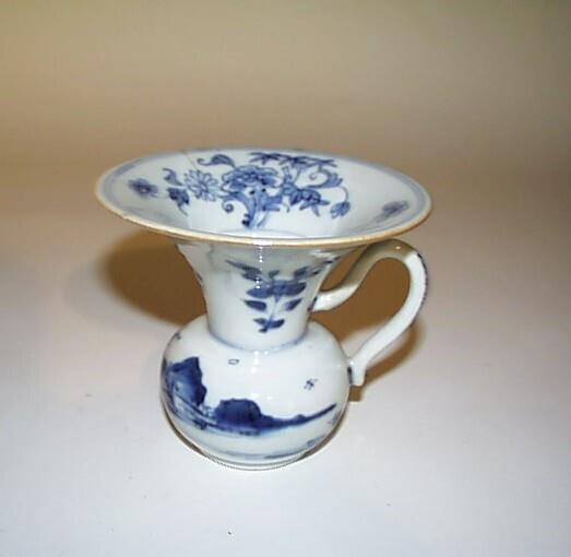 De bolvormige kwispedoor heeft een standring, een trompetvormige hals en een gegolfd oor. De binnenwand heeft twee decors van bamboe met bloesemtakken. De buitenzijde van de hals is gedecoreerd met bloemen en de buik heeft een decor van een rivier...