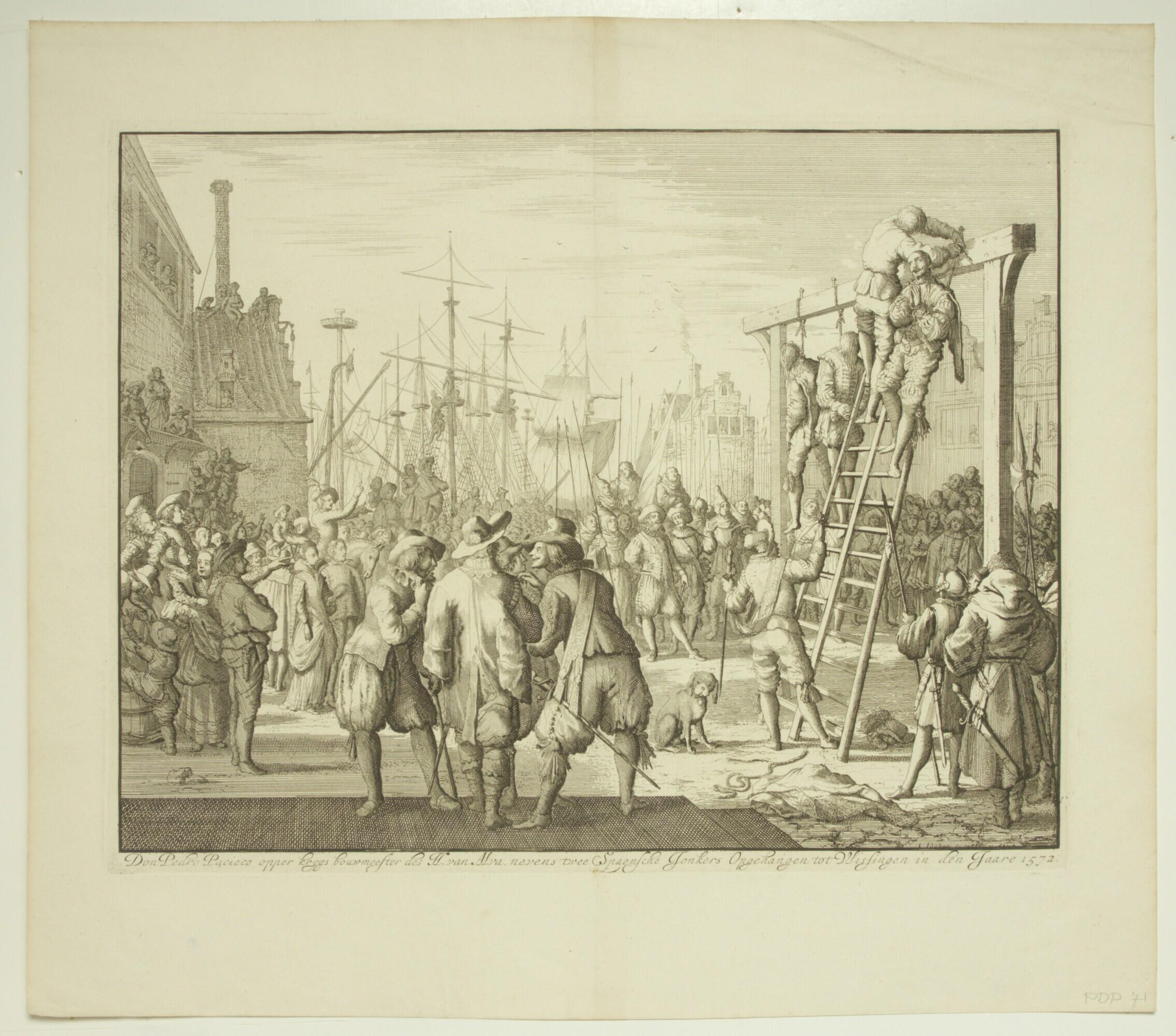 Don Pedro (of Fernando) Pacieco, krijgsbouwmeester (ingenieur) van de hertog van Alva wordt met twee andere Spanjaarden opgehangen te Vlissingen, 8 april 1572. Met vele toeschouwers, op de achtergrond de masten van de schepen aan de kade