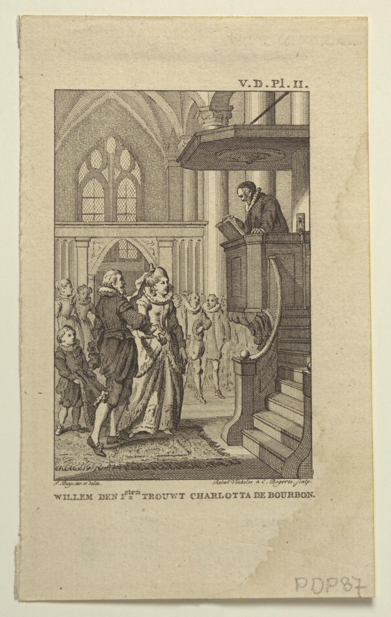 Huwelijk van Willem van Oranje en Charlotte de Bourbon in een kerk te Den Briel, 12 juni 1575. De prins en prinses staande voor een predikant in een preekstoel.