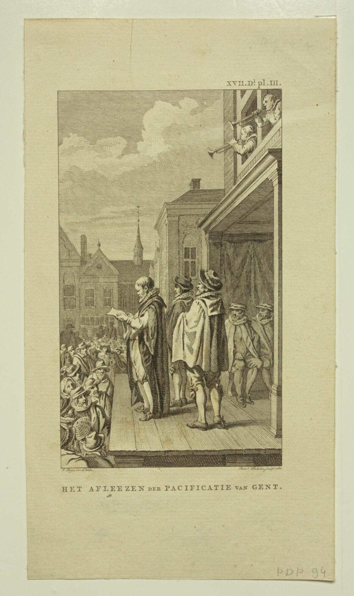 Bekendmaking van het ondertekenen van de Pacificatie van Gent op 8 november 1576. Op een stellage wordt aan het aanwezige publiek de vrede bekend gemaakt en voorgelezen. Uit de ramen blazen twee mannen op bazuinen.