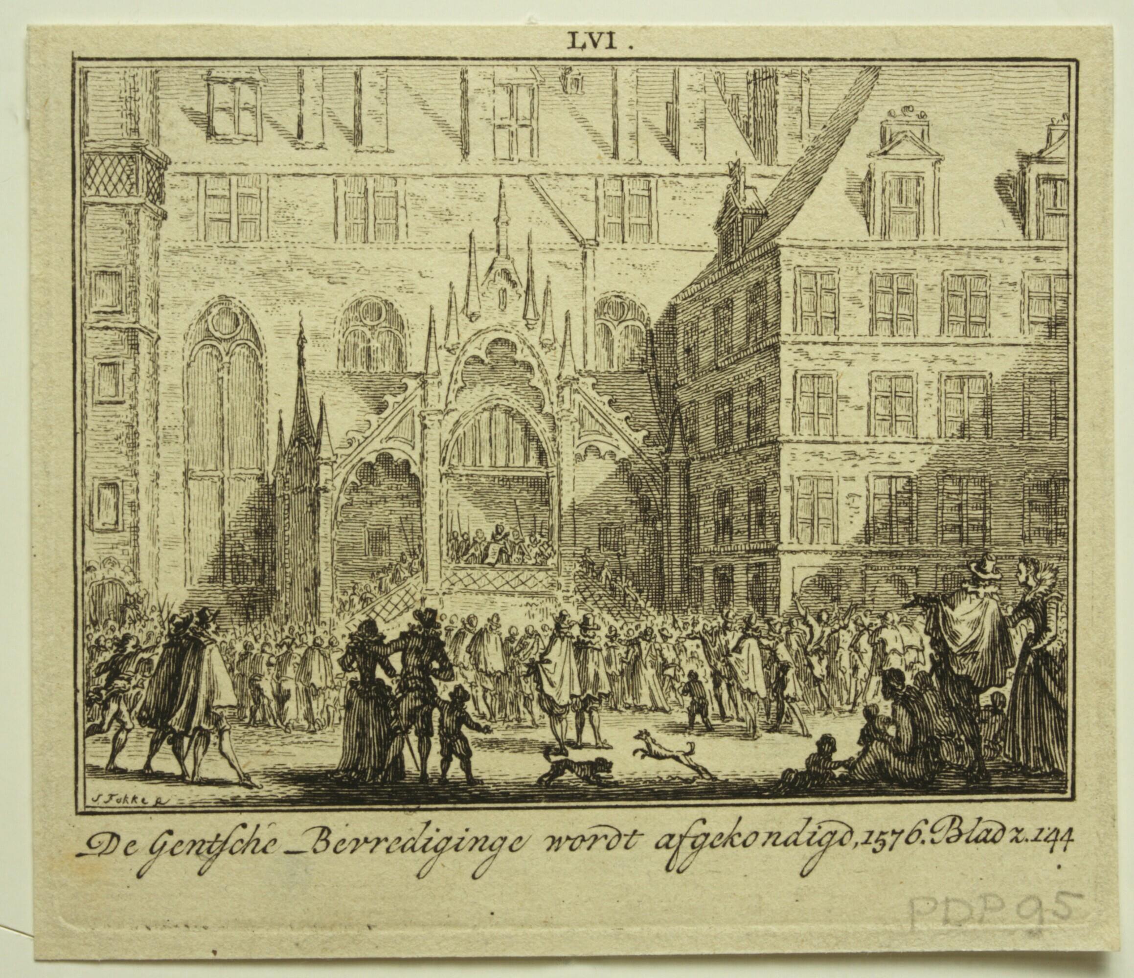 Afkondiging van de Pacificatie van Gent, 8 november 1576. Op de trappen voor een stadhuis of kerk wordt aan de aanwezige toehoorders de vrede bekend gemaakt en voorgelezen.