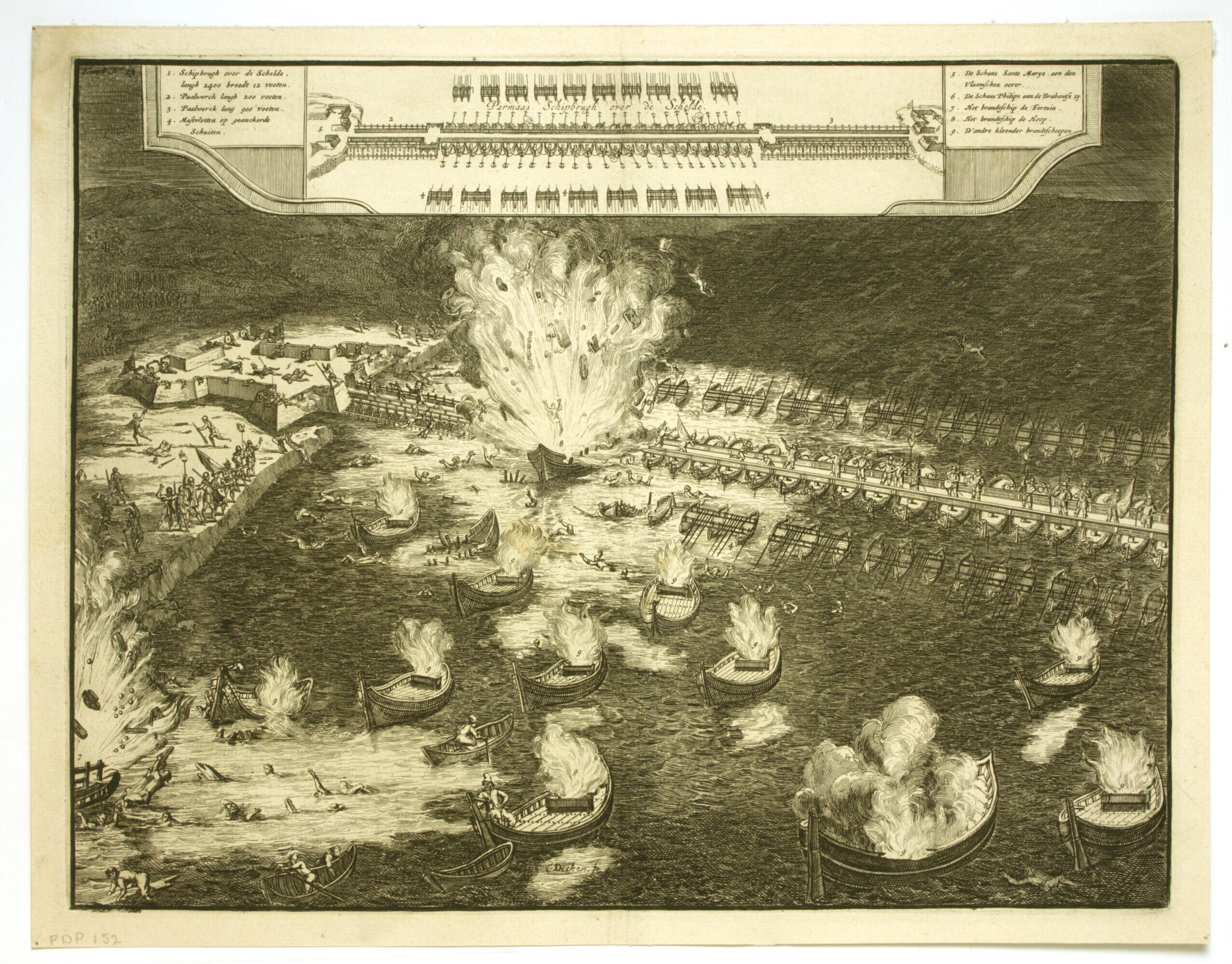 Het opblazen met branders van de schipbrug aangelegd door de hertog van Parma in de Schelde vóór Antwerpen, 5 april 1585. Bovenaan een inzet met de brug intact en de legenda 1-9 in het Nederlands.