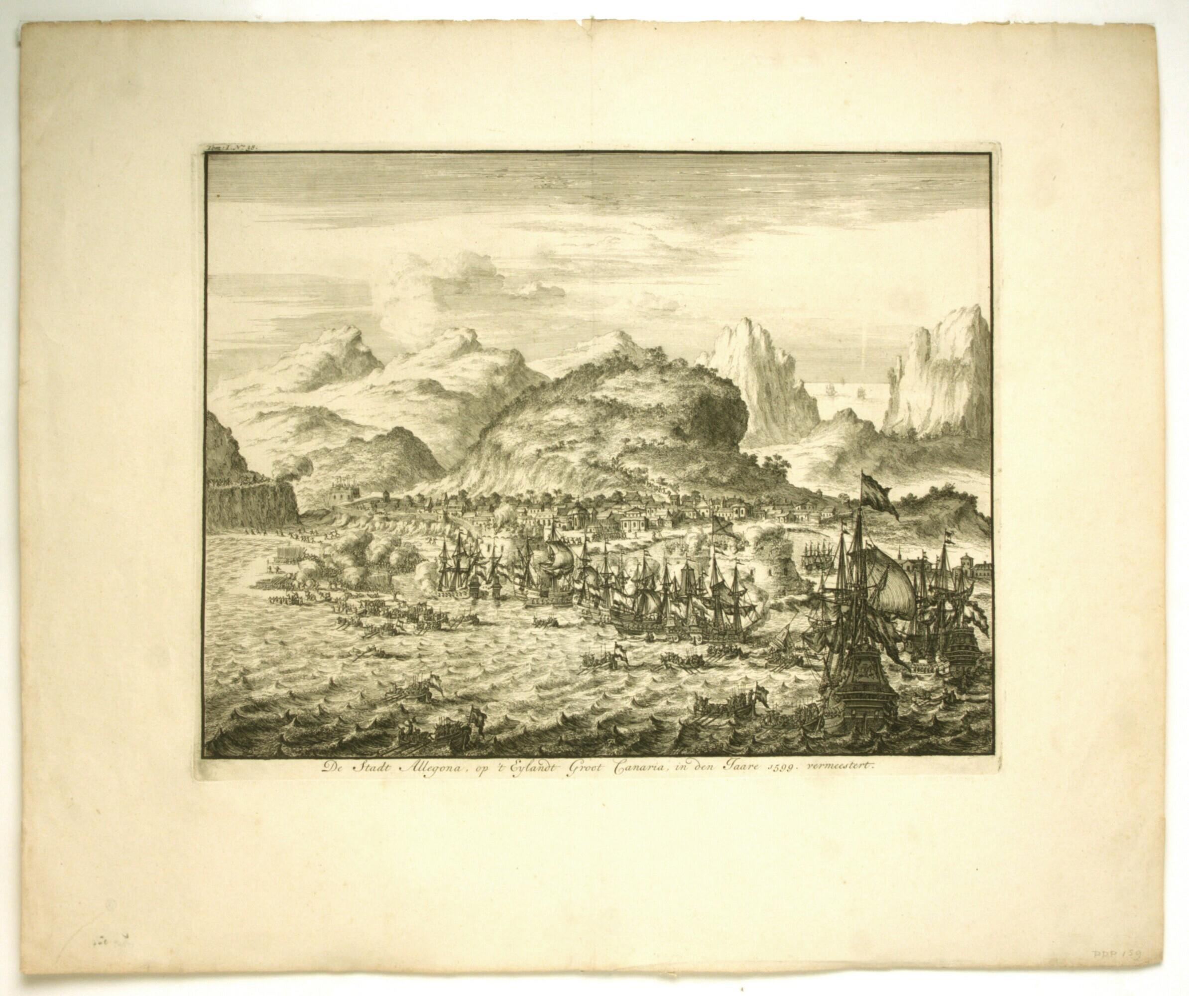 Verovering van het eiland Gran Canaria en de stad Allagona door de Staatse vloot onder admiraal Pieter van der Does, 26 juni 1599. Op de voorgrond de Nederlandse vloot, vanaf forten aan de kust beschieten de Spanjaarden de Hollandse schepen.