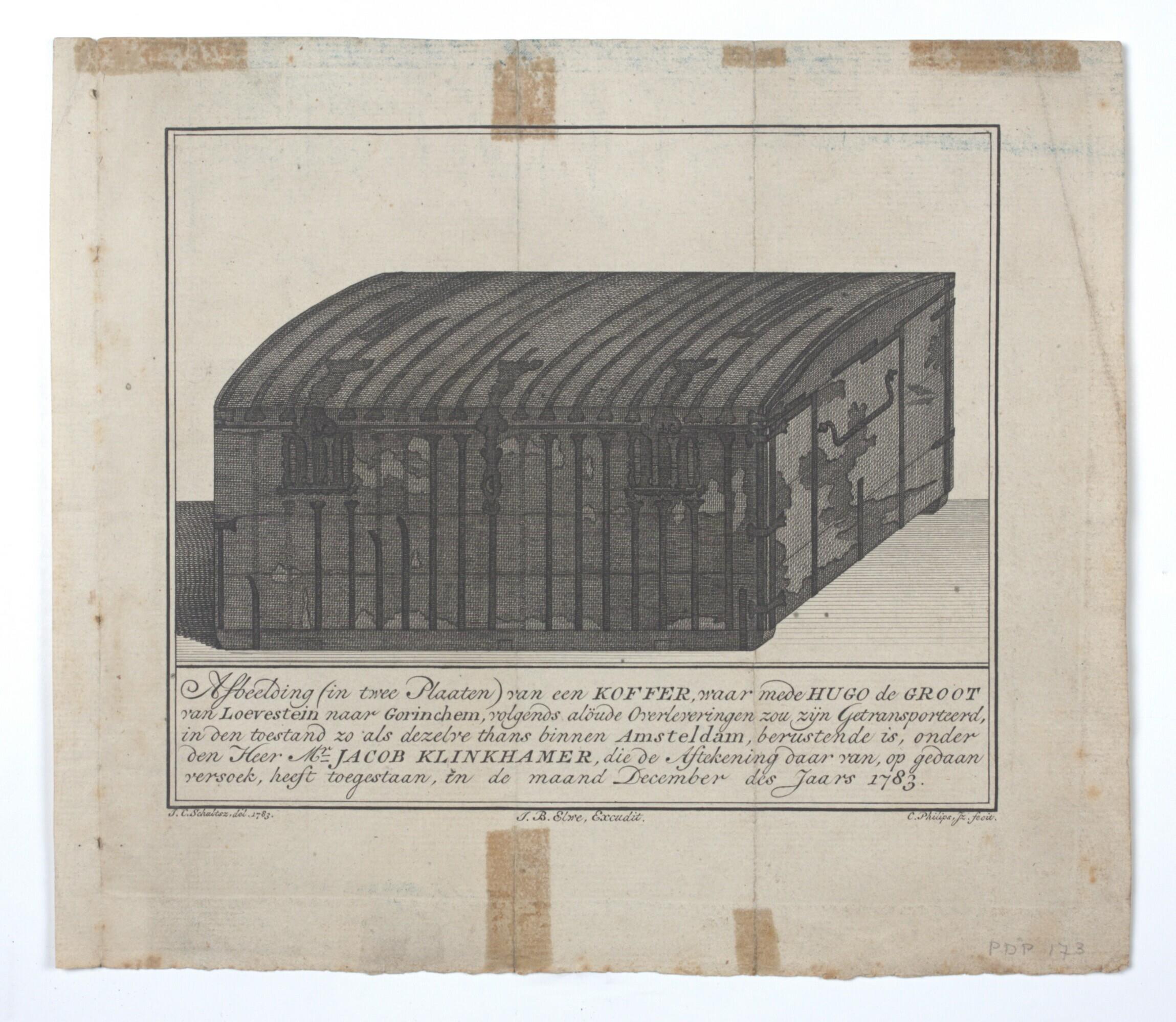 - 'Afbeelding (in twee plaaten) van een koffer, waarmede Hugo de Groot (1583 - 1645) van Loevestein naar Gorinchem, volgends aloude overleveringen zou zijn getransporteerd, in den toestand zoals dezelve thans binnen Amsteldam....'