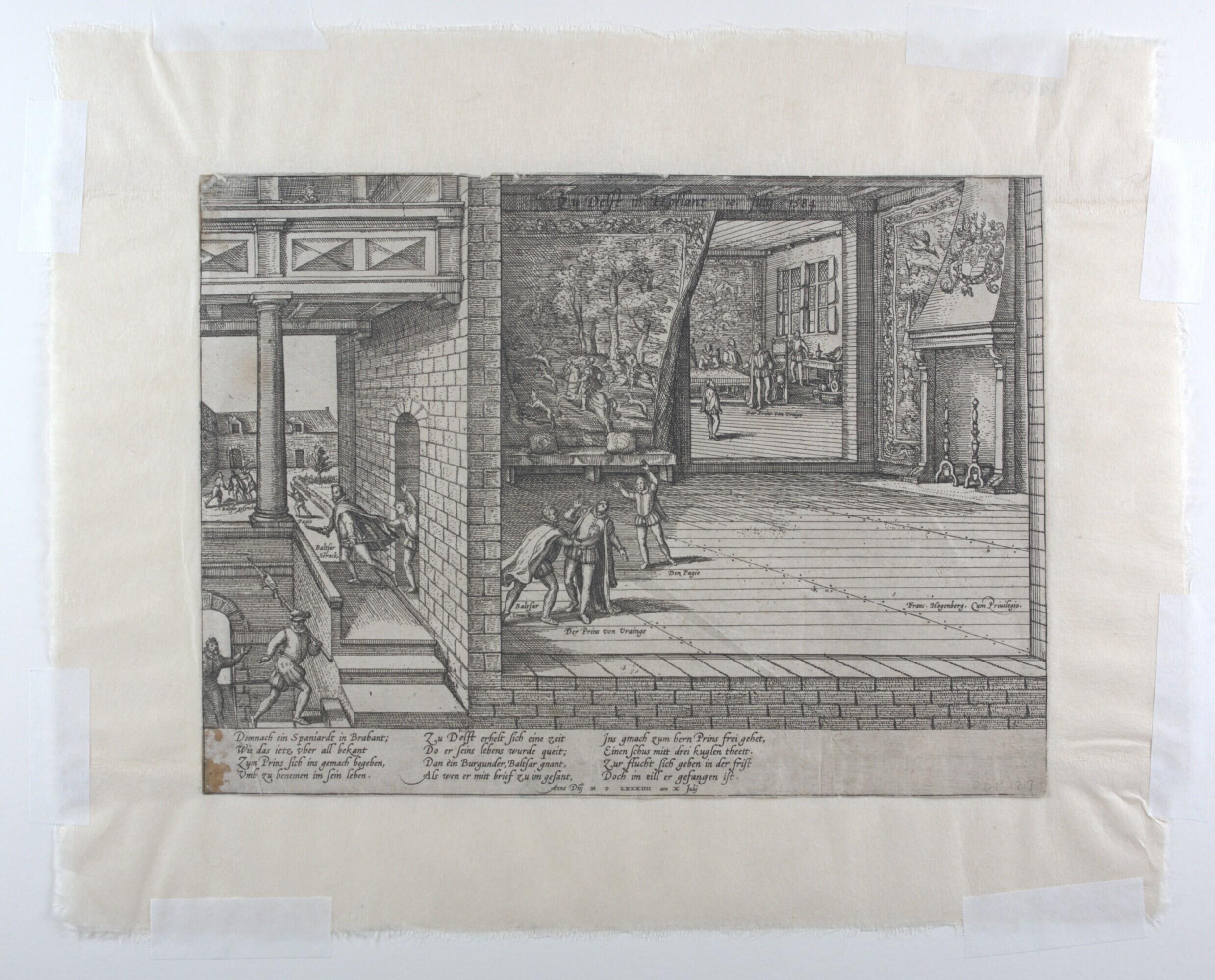 Gezicht op interieur Prinsenhof: achter ontvangt de prins Gerards in een kamer, op de voorgrond wordt de prins neergeschoten. Links prob...