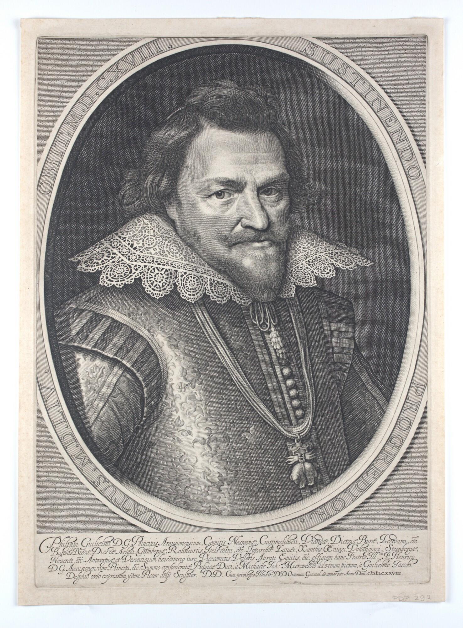 In ovaal met randschrift 'Sustinendo Progedior Natus MDLIV OBIIT MDCXVIII' en 5-regelig Latijns onderschrift: