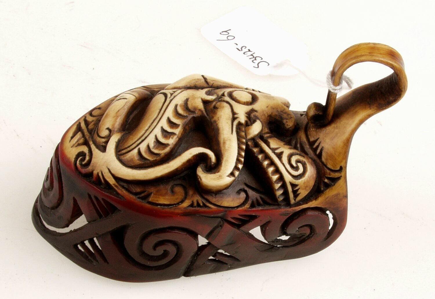 Een hanger gemaakt van de snavel van de neushoornvogel. Door verhitting is een gebogen haak gemaakt om het aan de uitgerekte oorlel te hangen. De bovenkant is versierd met een draak motief. Dergelijke oorhangers worden gedragen door dappers krijge...