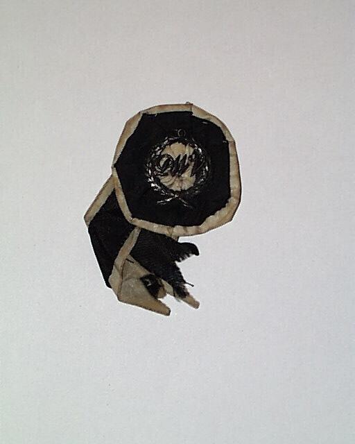 Zwart-witte rozet met lint met op de rozet een metalen lauwerkrans met daarin de letters DWV.
