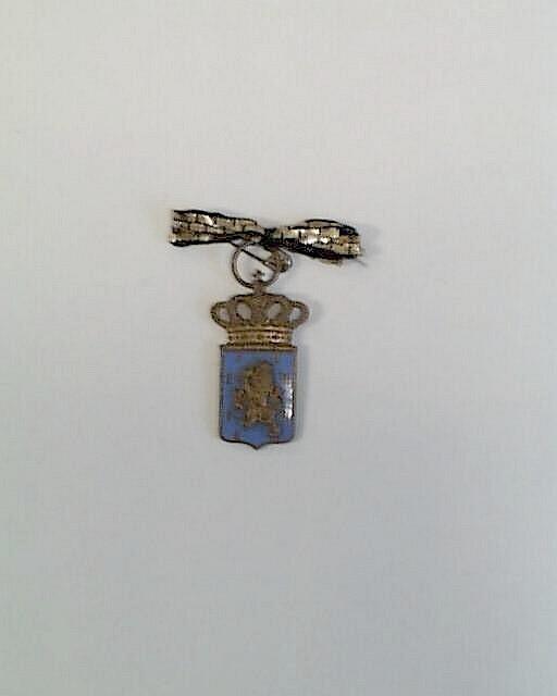 Onderaan de strik zit een ring met een medaille en bovenaan een kroon met eronder een rechthoekig blauw geëmailleerde plaque met daarop een leeuw.