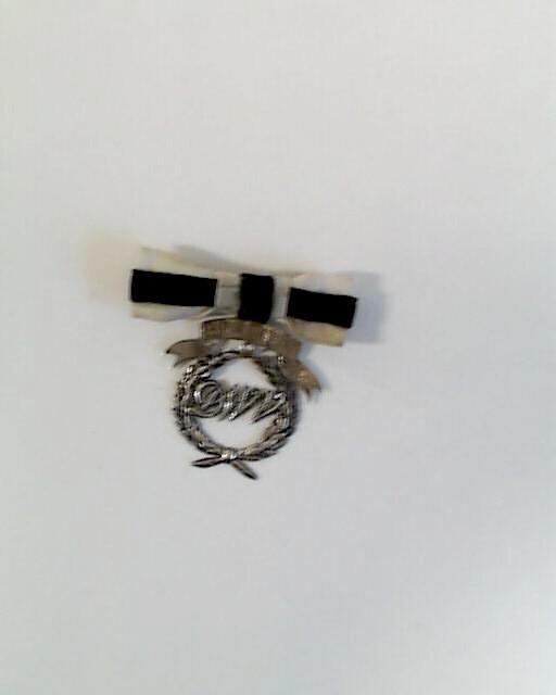 Zwart-witte strik met eraan een metalen lauwerskrans met daarin de letters DWV. bovenaan de krans een lint met daarop "bestuur"