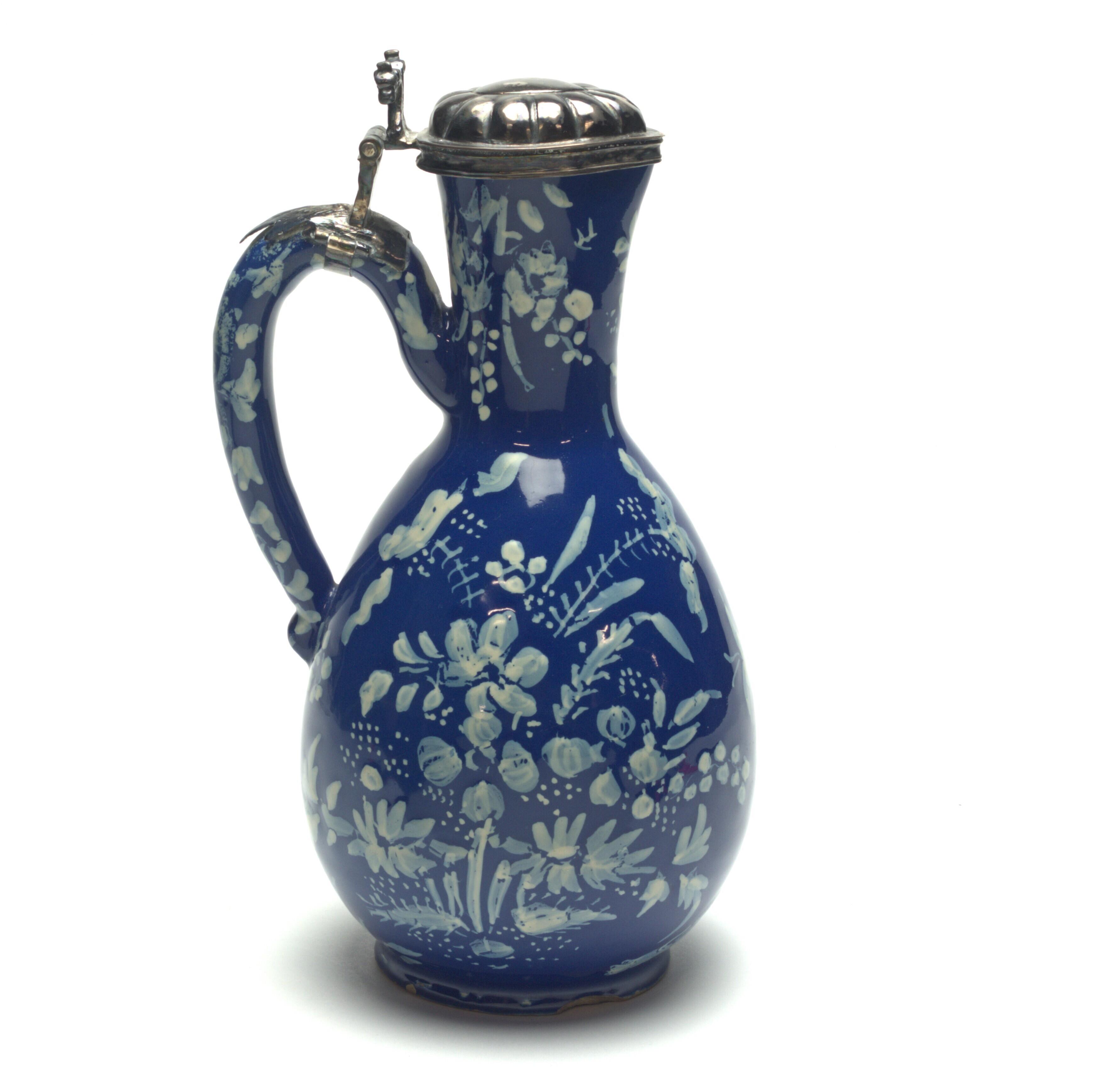 - Twee Delftse faience kannen, elk met een zilveren deksel.