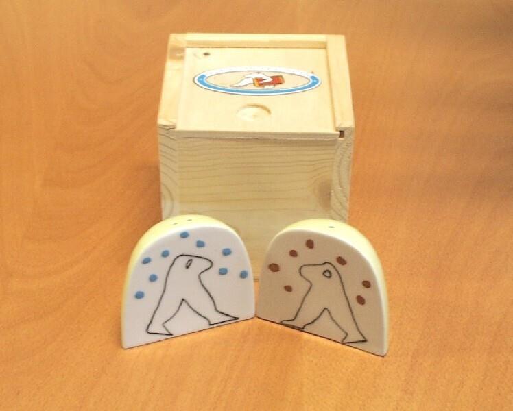 Peper en zoutvaatjes in de vorm van een halve stolp, tesamen een stolp vormend. Aan de vlakke binnenzijden het logo van Hizkia van Kralingen Art Packers and Shippers, Den Haag.