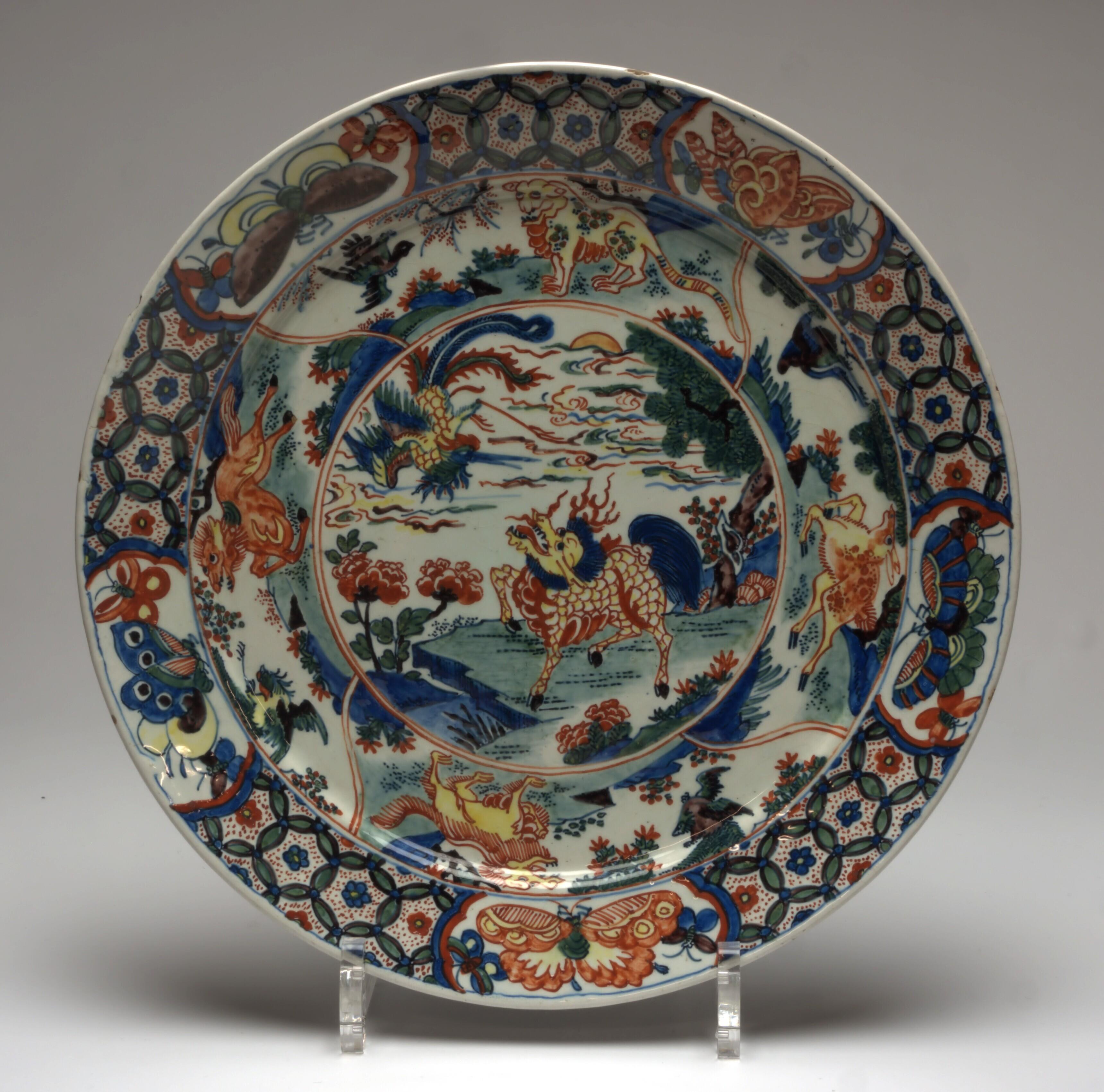 Het zonder standring uitgevoerde bord loopt aan de achterkant iets bol naar een vlak middendeel. Aan de voorkant is in het plat een medaillon afgebeeld met Chinese mythologische dieren (Kylin en Fong-Hoang in een landschap. Hieromheen is een band ...