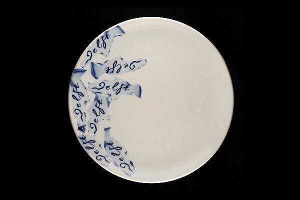 Groot plat bord van wit porselein. Het bord is voor een deel, vanaf de rand, voorzien van transfers in blauw met het woord Delft in een willekeurige rangschikking.