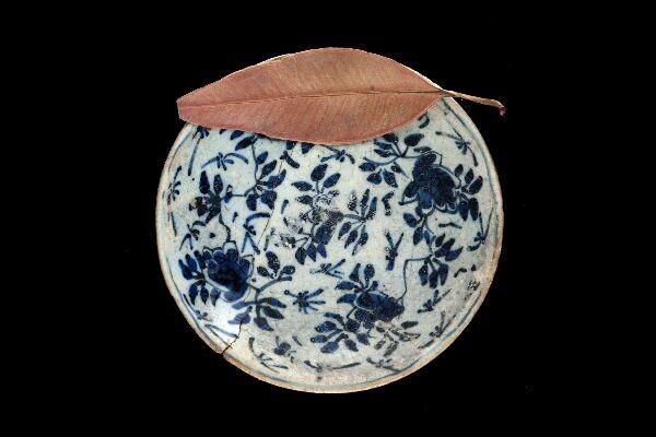 Beschrijving van het (kunst)werk: Schoteltje van aardewerk met een strooibloem patroon in blauw en een aanvulling door middel van een eucalyptusblad. Het gebroken en gelijmde schoteltje met een strooibloem patroon in blauw heeft op de rand een aan...