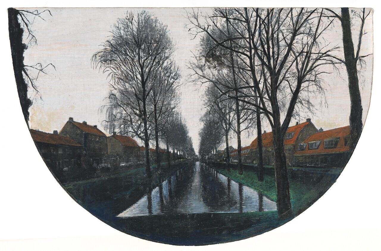 Beschrijving van het (kunst)werk: Koningin Emmalaan gezien vanaf de Schoemakerstraat waar de sloot plotseling ophoudt. Een verlaagde brede sloot met brede oevers, kale bomen en sombere huizen. Alles onder een flauwe rozige lucht. De weerspiegeling...