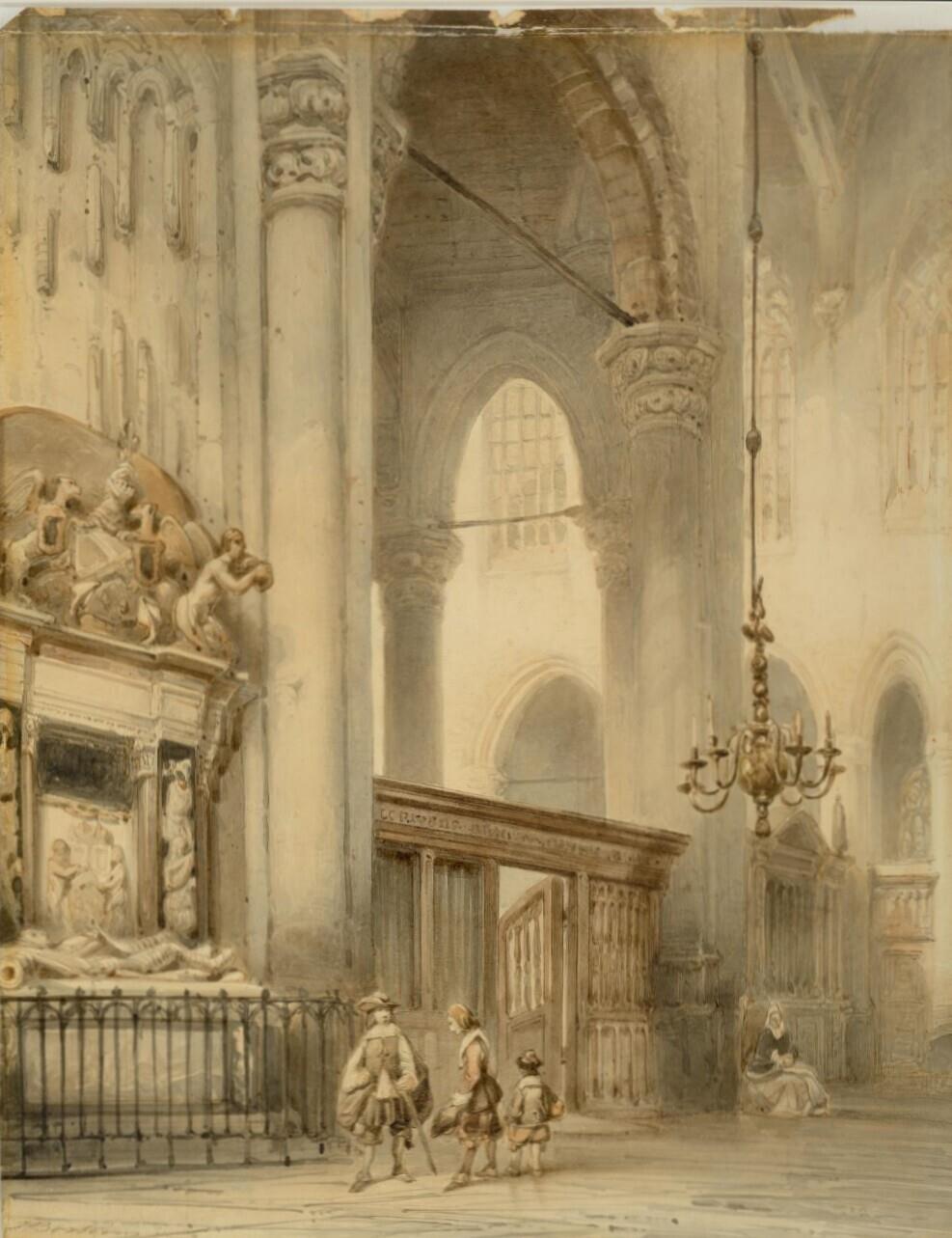 Interieur van de Oude Kerk aan de Oude Delft met links het praalgraf van Maerten Harpertszoon Tromp en rechts de koorhekken. Gezien naar het zuidoosten met figuren in 17de eeuwse kleding.