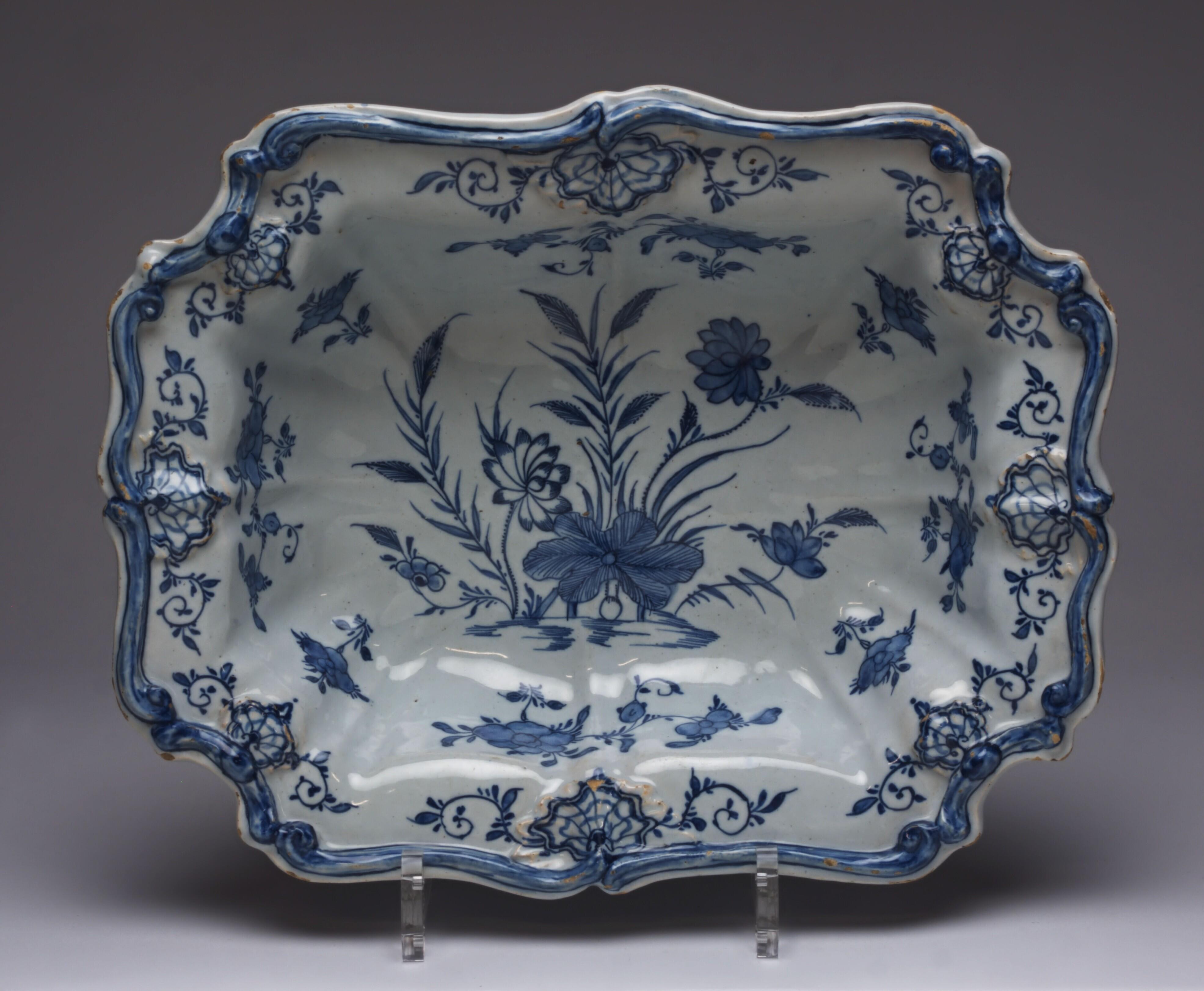 De rechthoekige geschulpte kom heeft een naar buiten gebogen rand die is voorzien van C en S voluten en schelpen in reliëf. Aan weerszijden van de schelpen zijn ranken geschilderd. Het plat is gedecoreerd met een kleine vaas op een grondje omgeven...