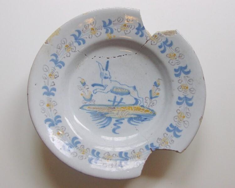 Wit faience bord uit Haarlem, aigrette-rand en een springend haasje op een 'grondje' in blauw, geel en mangaan.