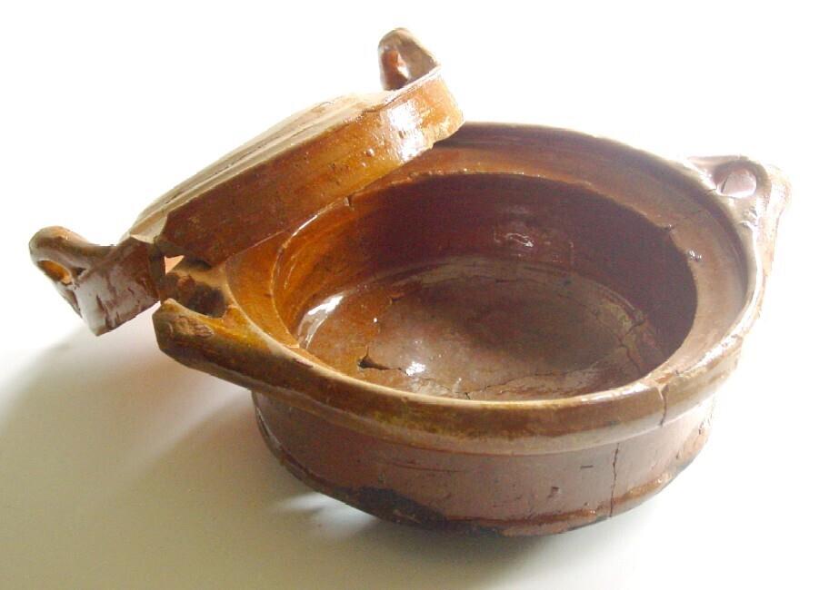 Bakschaal met worstoren en deksel. Gebruiksaardewerk ging men steeds meer geheel voorzien van een loodglazuurlaag.
