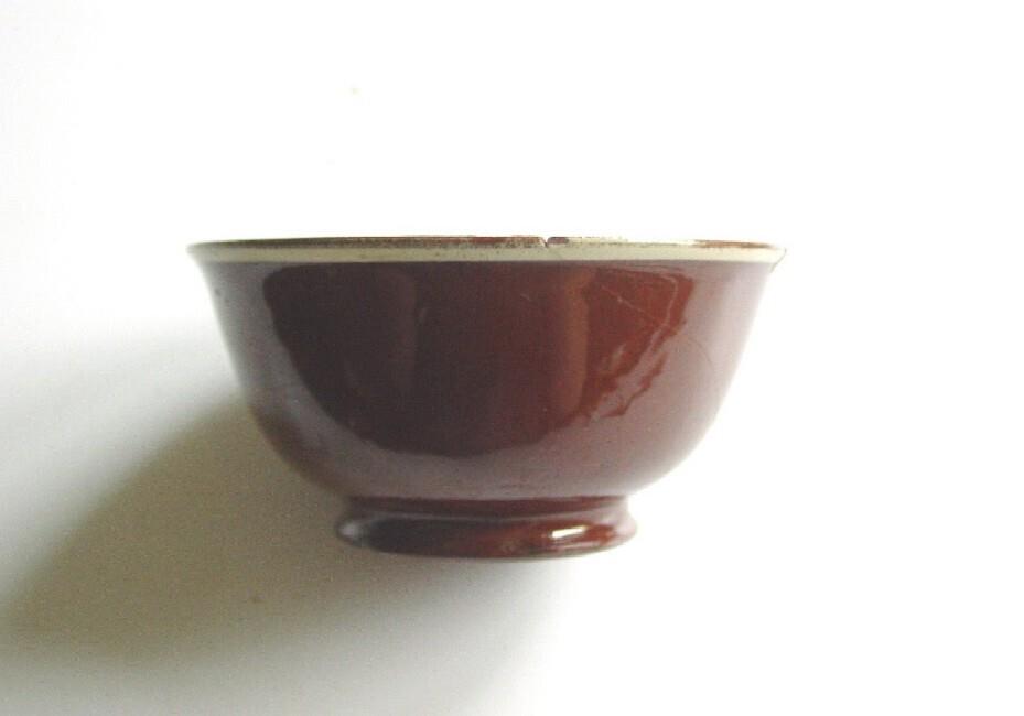 Industrieel bruin geglazuurd aardewerk kom met gele rand.