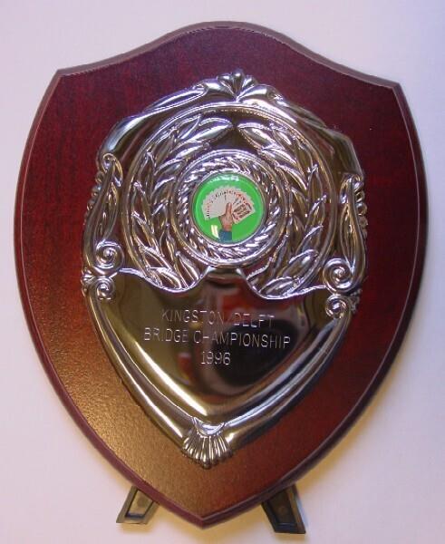 Achtergrond van gelakt hout, met daarop van blik een versiering. In het midden een hand die de spelkaarten ophoudt. Hieronder Kingston/Delft, Bridge Championship 1996. Aan de achterkant een plastiek standaard.