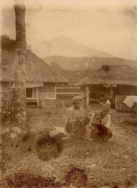 'Inlandsch groepje, de berg Tjikoeraj op den achtergrond'