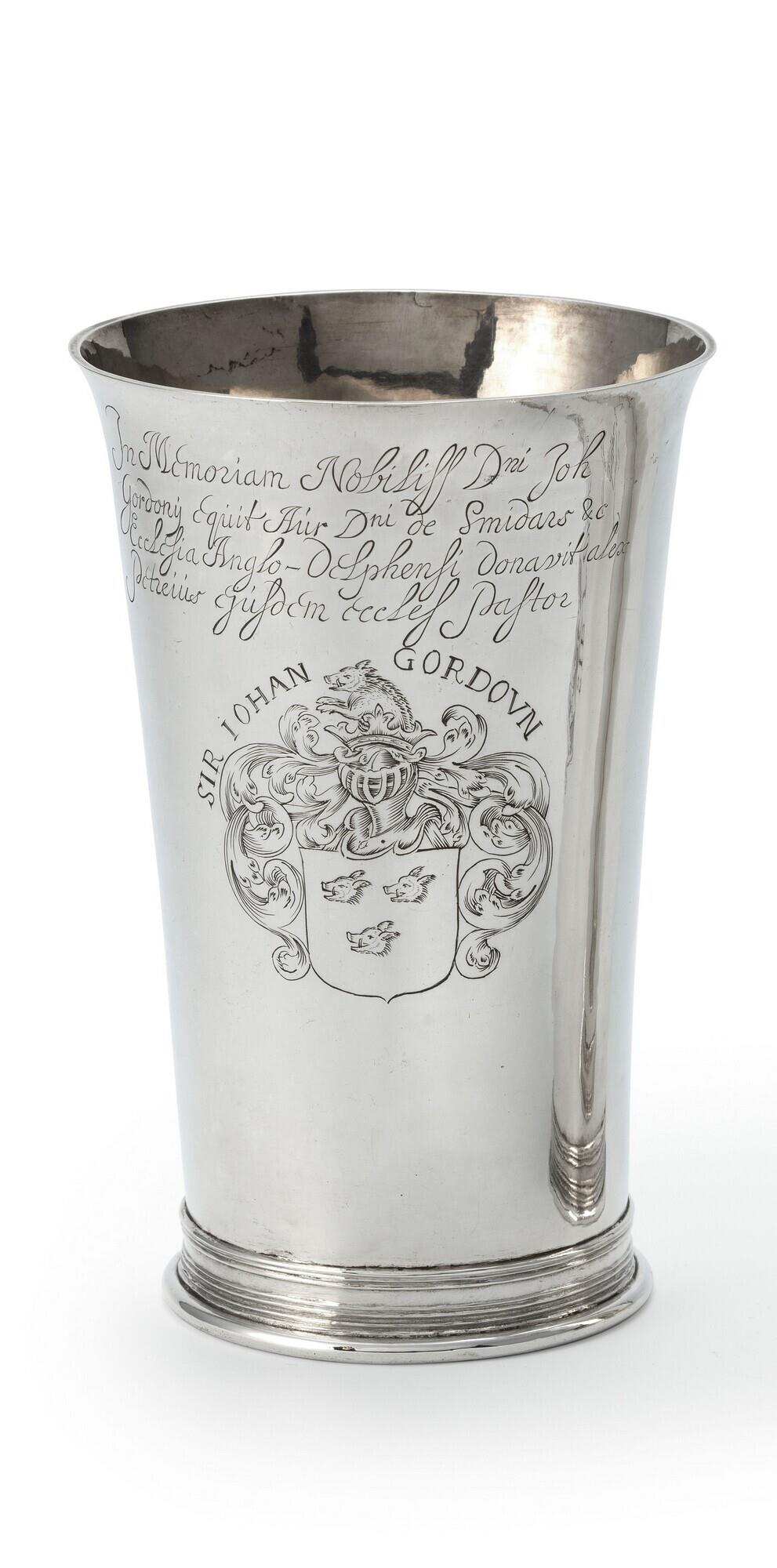 avondmaalsbeker met inscriptie: 'Sir Johan Gourdon' en een wapen met 3 everzwijnkoppen
